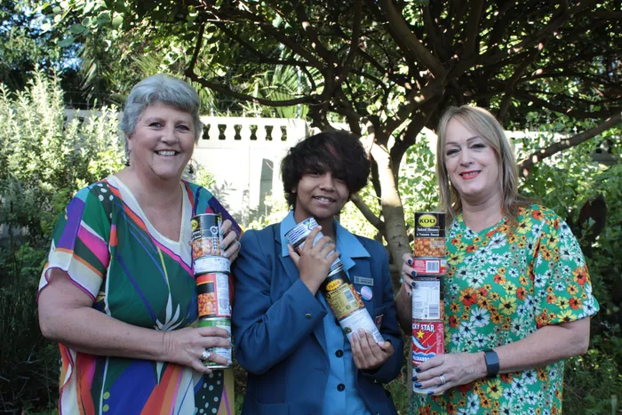 Sans Souci Girls’ High pupil Chloe Jooste with her canned food, flanked by acting school principal Shirley Humphreys, left, and school administrator Tracey Commerford.