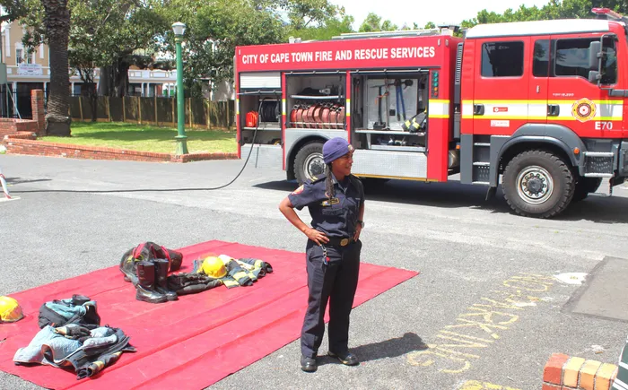 Firefighter Amiena Pillay gives the children a briefing on how their fire equipment works.
