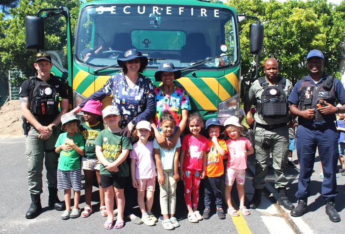 The United Playcentre crèche children with the private security officers in front of the fire engine.