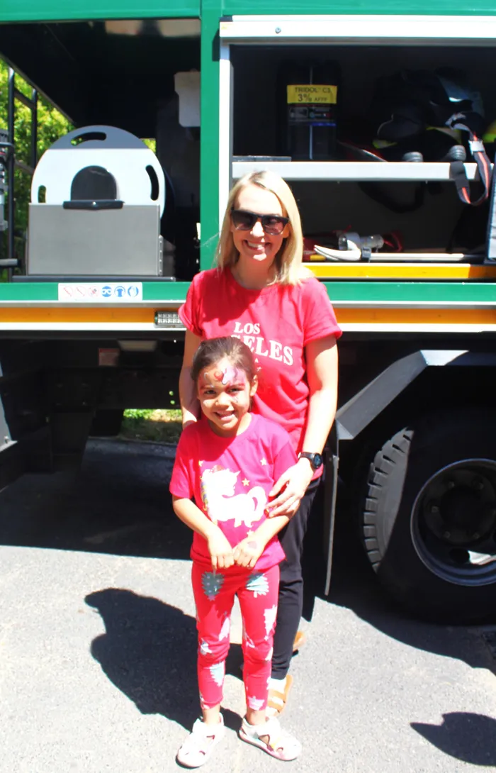 Mum, Jaclyn Goliath and her daughter, Allegra by the fire engine.