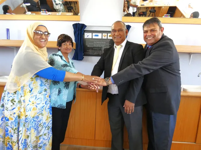 Livingstone High unveils its new science lab. From left is principal Raliyah Ganie, Garden Cities Archway Foundation chairperson, Myrtle February, Advancing Knowledge director Professor Shaheed Hartley, and Garden Cities Archway Foundation CEO, John Matthews.