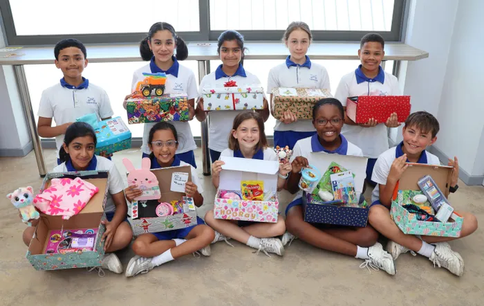 The Cannons Creek Grade 5 pupils with their Santa Shoebox gift box. Back from left are Eli Naidoo, Atiya Kaplen, Kanushi Sharma, Scarlett Kooyman, Jade Brown, and in front from left are Sakina Omar, Sakeena Raciet, Amy Hoflinger, Kaboentle Mathe, and Ronan Potgieter.