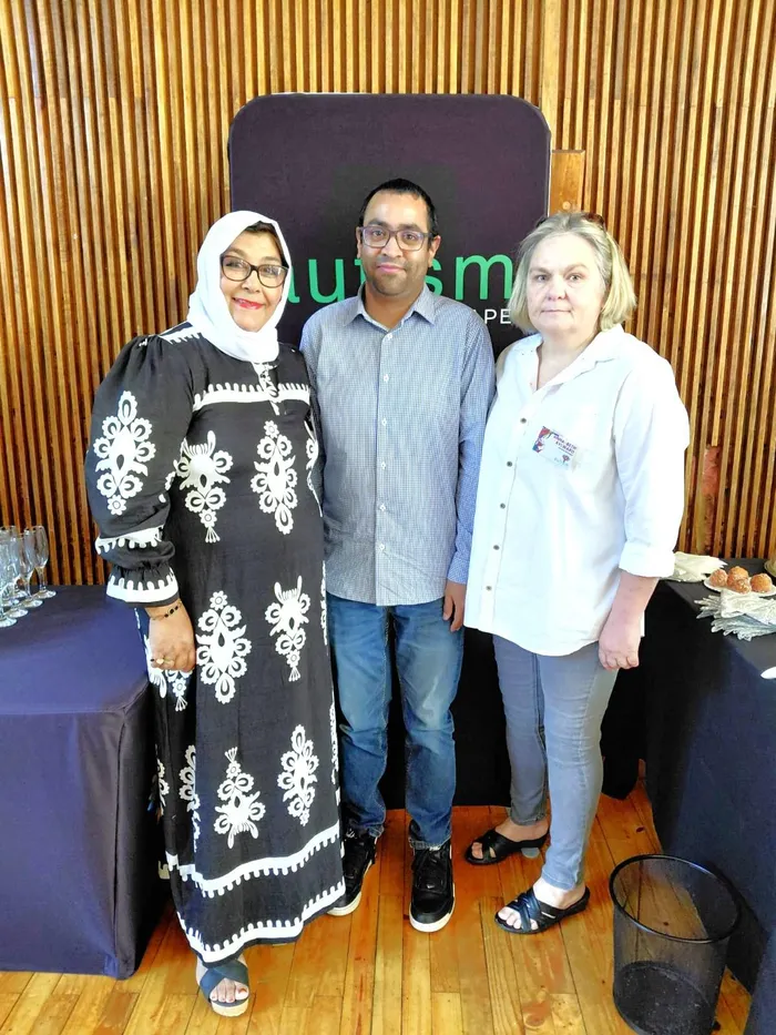 Supporting the artwork from left are Autism Western Cape (AWC) training manager and co-ordinator, Roshan Subailey, Guest Speaker and Adult on the Spectrum and former training officer at AWC, Wajeed Parker, and AWC general manager, Anna-Beth Aylward.