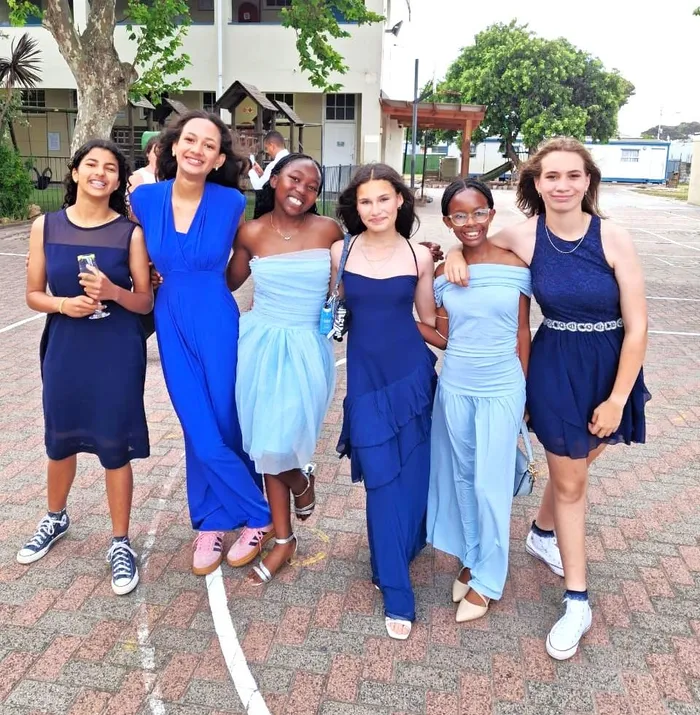 The Grade 7 Vine School girls dressed in blue. From left are Grace Mulligan, Inez Ronee, Shyleen Chavula, Zineah Japtha, Azania Khanyile and Jessica Esterhuizen.