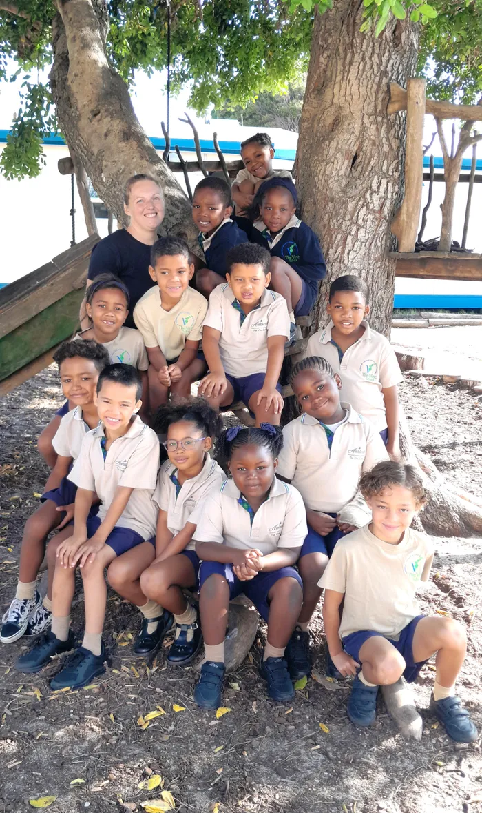 The Vine School Grade 1 classroom with their teacher, Nadia van Huyssteen.