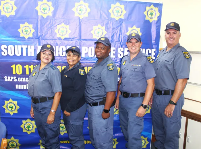 From left is Pinelands police station commander, Lieutenant Colonel officer Darleen Koopman, along with the station’s newly promoted warrant officers, Rene Wally, Zola Magidigidi, Johnny White, and Tertius Kotze.