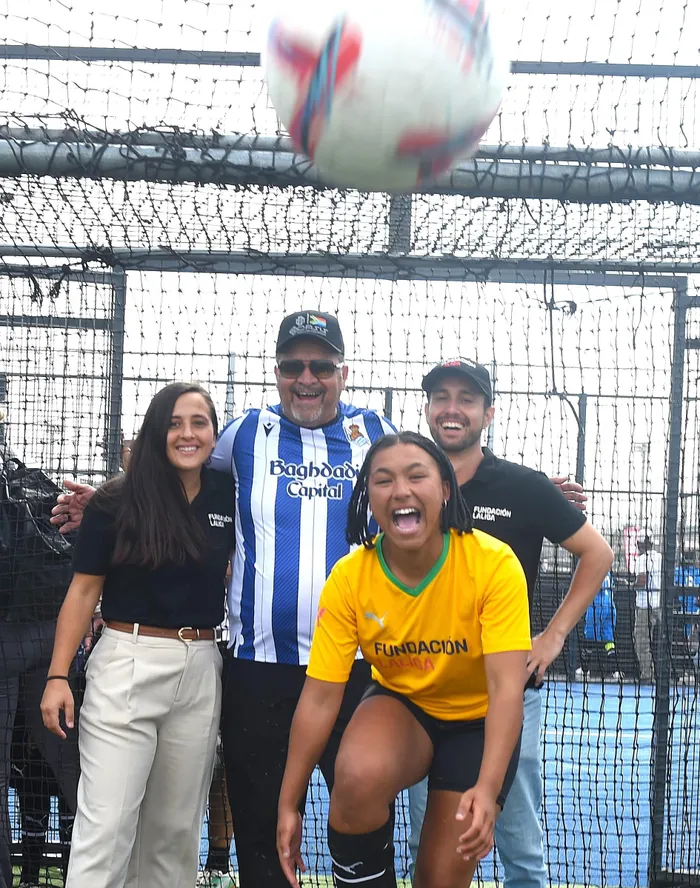 Aintzane Encinas - LALIGA International Ambassador and a former Real Sociedad women's footballer, Cliffie Martinus, head of Oasis, NGO, Paul Dreisbach of LALIGA South Africa. and Joey Ruiters share a light moment during Saturday's opening round of a six-week tournament, at Fives Futbol, in Century City